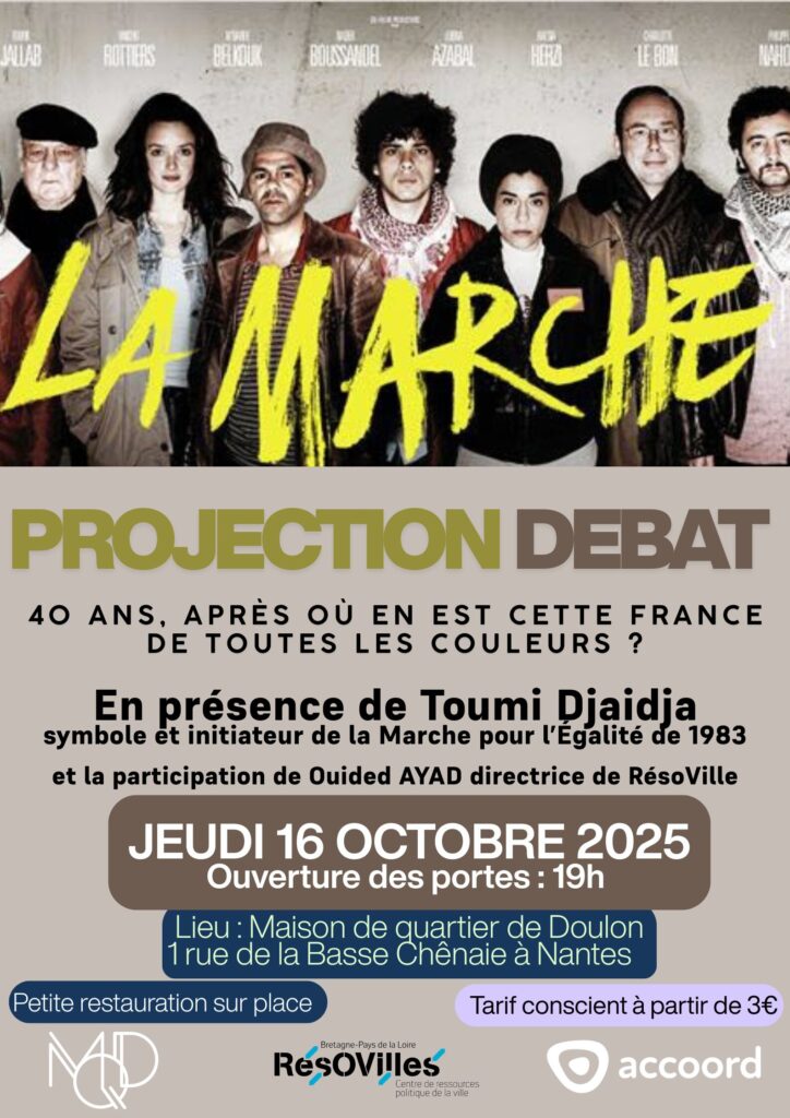 Une projection-débat est organisée à la Maison de quartier de Doulon, à Nantes, le jeudi 16 Octobre à partir de 19h. La projection du film « La Marche » réalisé par Nabil Ben Yadir, sera suivie d’un débat en présence de Toumi Djaidja, figure emblématique et initiateur de la marche pour l’égalité de 1983 et […]
