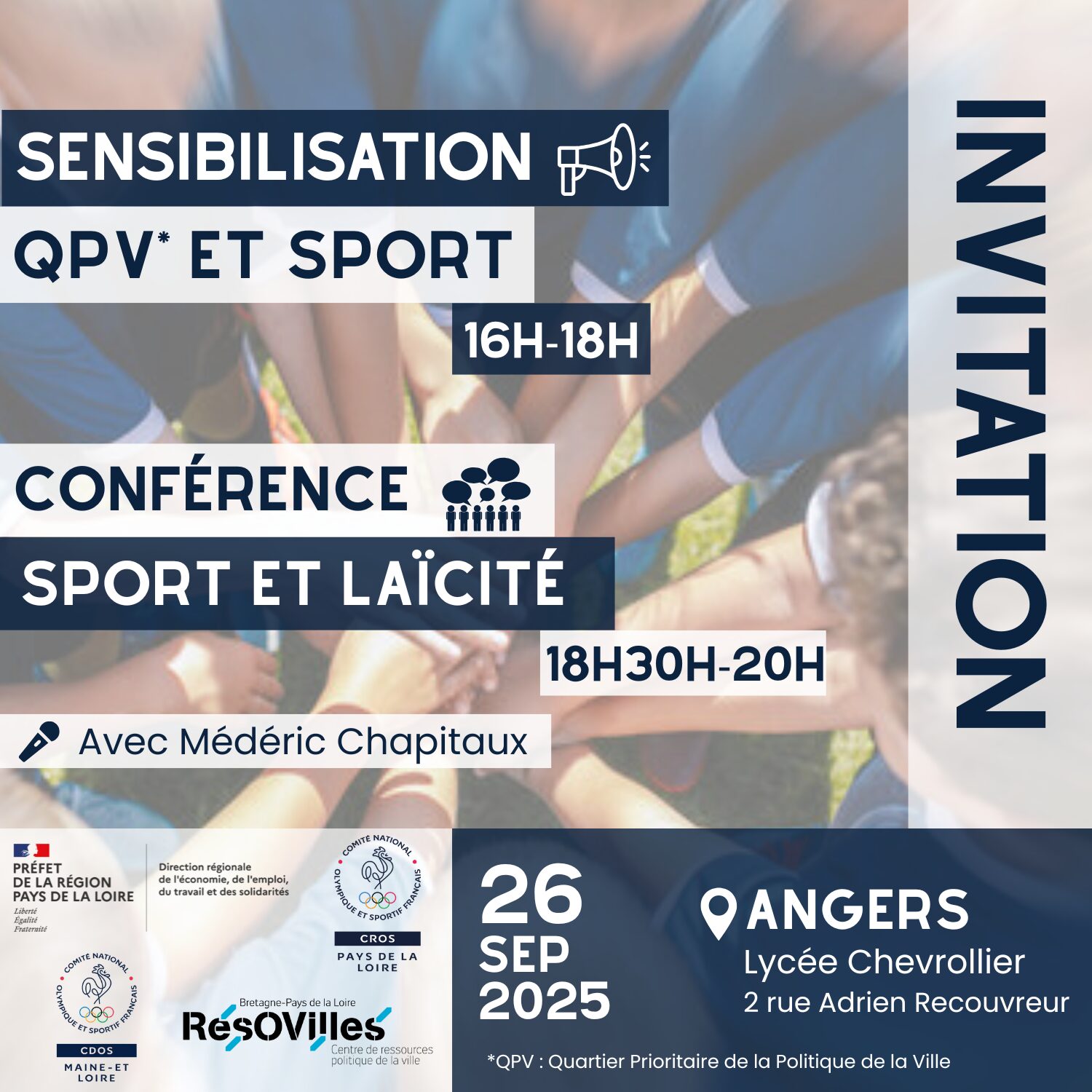 LE CROS des Pays de la Loire, en partenariat avec la Direction Régionale de l’Économie, de l’Emploi, du Travail et des Solidarités (DREETS), RésO Villes Bretagne – Pays de la Loire et le CDOS Maine-et-Loire, a le plaisir de vous inviter à un événement autour des thématiques suivantes : « Le sport comme vecteur d’inclusion dans les Quartiers de la Politique de la Ville » et « La laïcité : enjeux et pratiques dans le milieu sportif ».