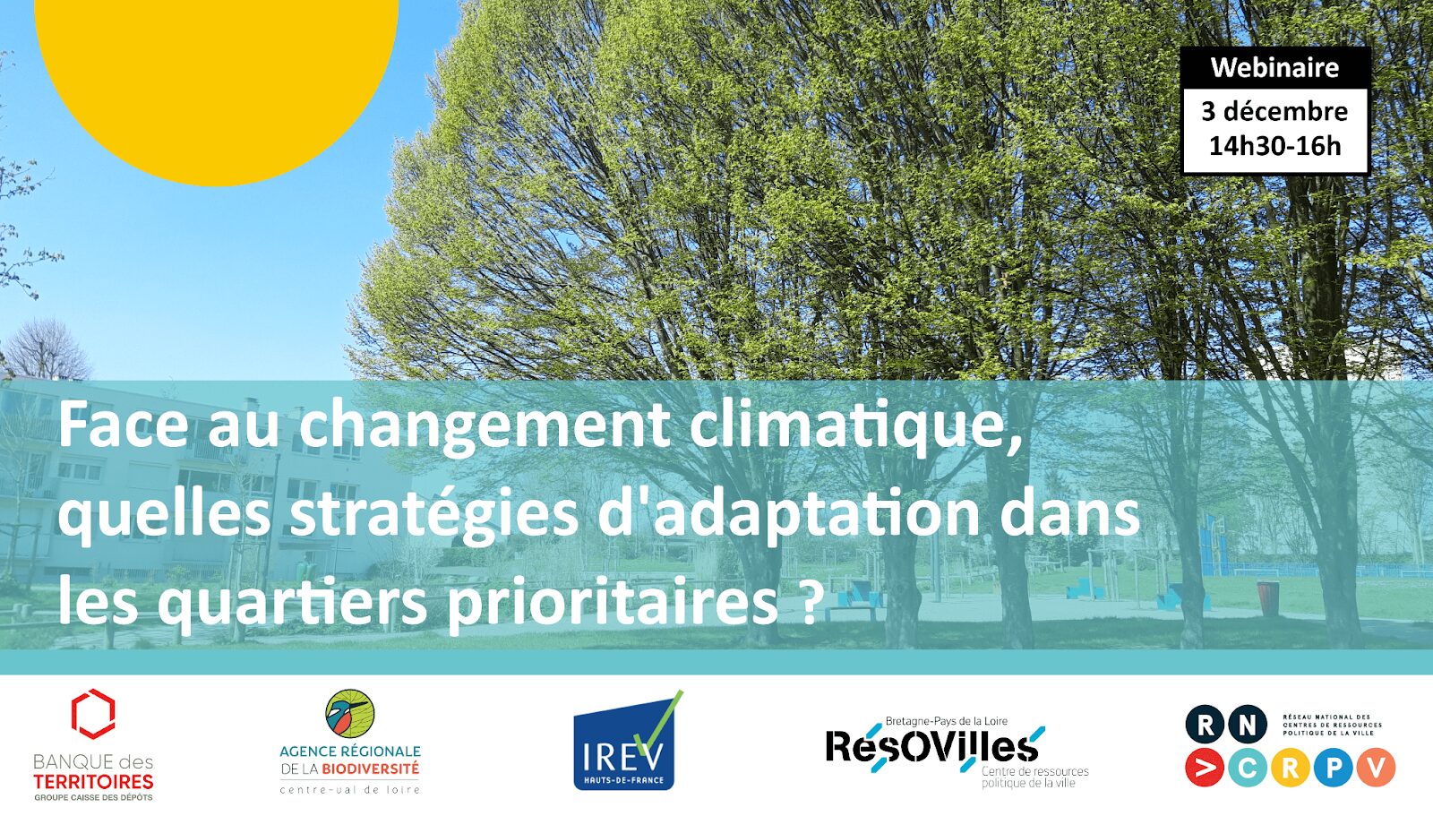 Ce webinaire s’adresse aux acteurs de la politique de la ville, de la transition écologique, aux bailleurs sociaux et aux associations. Il permettra de partager les avancées, analyses, questionnements, besoins sur ce sujet et de contribuer à préciser les enjeux et conditions de développement de politiques d’adaptation au changement climatique des quartiers prioritaires.